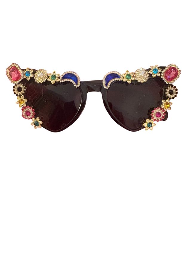Channeling royal garden glamour, the Regal Bloom Frames blend jet-black heart lenses with jewel-toned florals and gemstone appliqués. Bold ruby, sapphire, and emerald accents line the edges, while golden floral details add a regal finish. These sunnies radiate opulence, perfect for runways, red carpets, or any queen making her entrance
